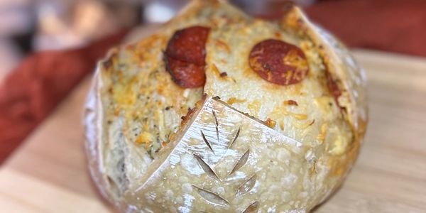 Baked fresh in our kitchen with the same slow-fermented, hand-crafted process as our classic sourdough, this loaf features a blend of mozzarella, herbs, and rich pepperoni flavor baked right into the dough. Every slice is a perfect balance of crispy crust and soft, airy interior, with bursts of pizza-inspired flavor in every bite.